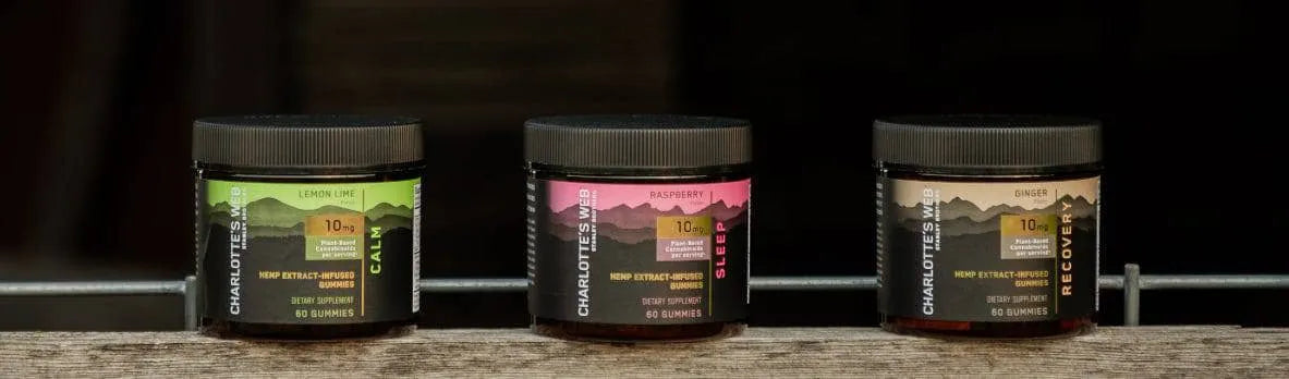 Three jars of Charlotte's Web Gummies on wooden shelf.